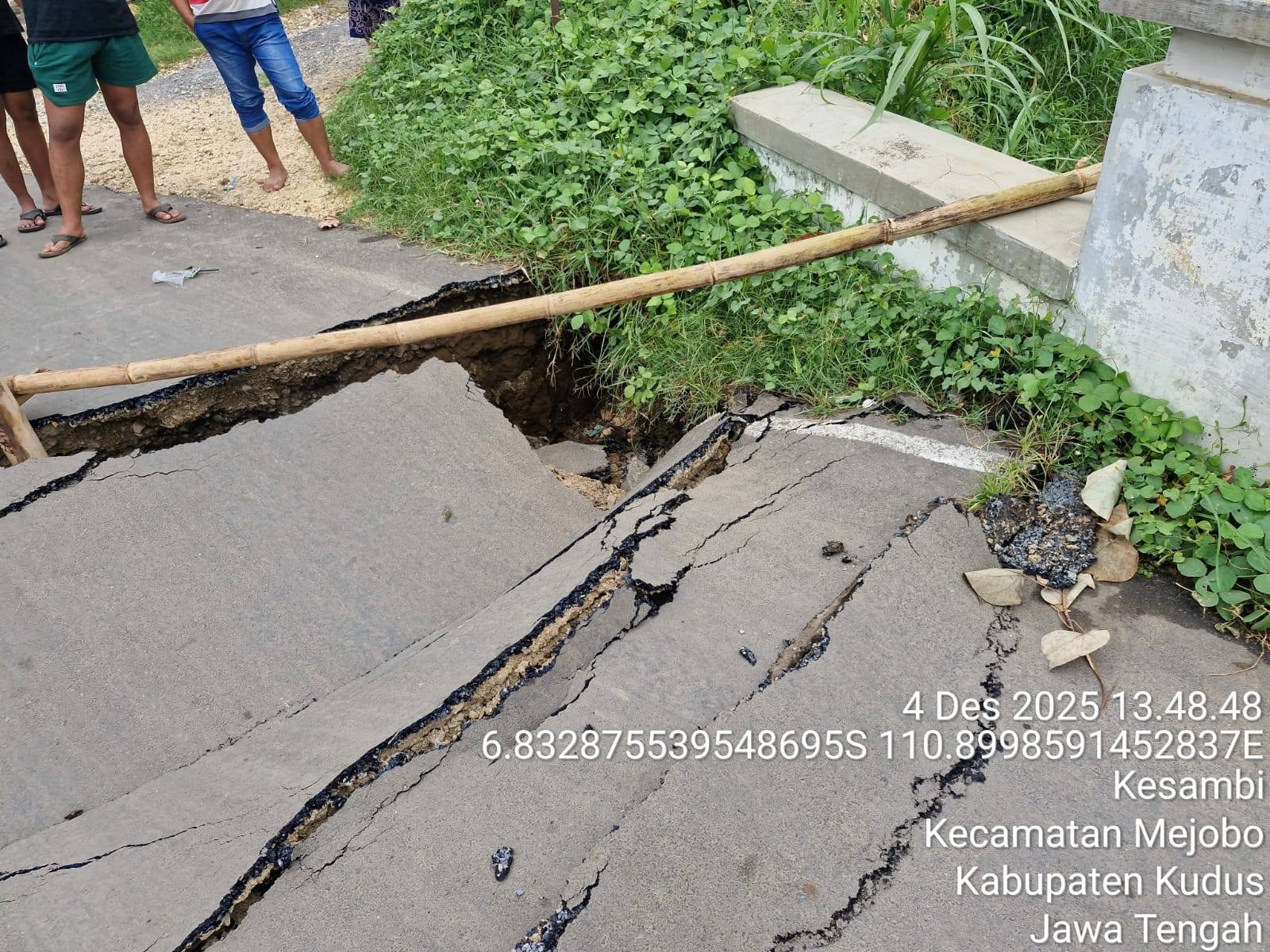 KUDUS – Jembatan 1 di Desa Kesambi, Kecamatan Mejobo, mengalami kerusakan serius setelah bagian konstruksinya ambruk pada Kamis siang (4/12/2025). Insiden tersebut dipicu oleh derasnya aliran sungai yang membawa gulungan sampah bambu pascahujan lebat.