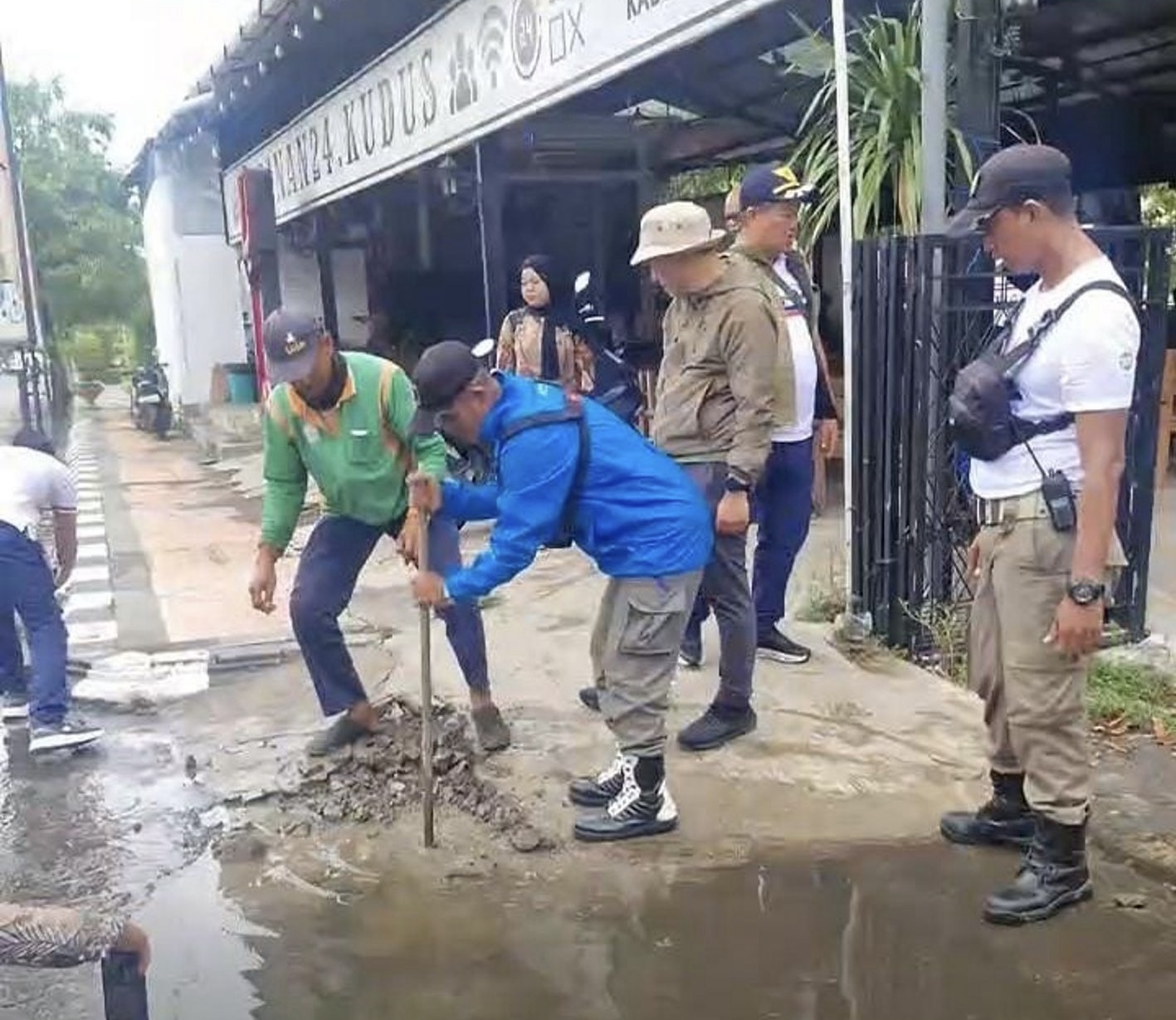 KUDUS – Bupati Kudus, Samani Intakoris, melakukan peninjauan langsung kondisi saluran air di sepanjang Jalan A. Yani, Kecamatan Kota, Kabupaten Kudus, Jumat pagi (14/11), setelah hujan deras yang mengguyur kawasan perkotaan pada Kamis malam. Dalam tinjauannya, bupati menemukan adanya genangan air yang masih bertahan dan belum mengalir sempurna ke dalam saluran yang berada di bawah trotoar.