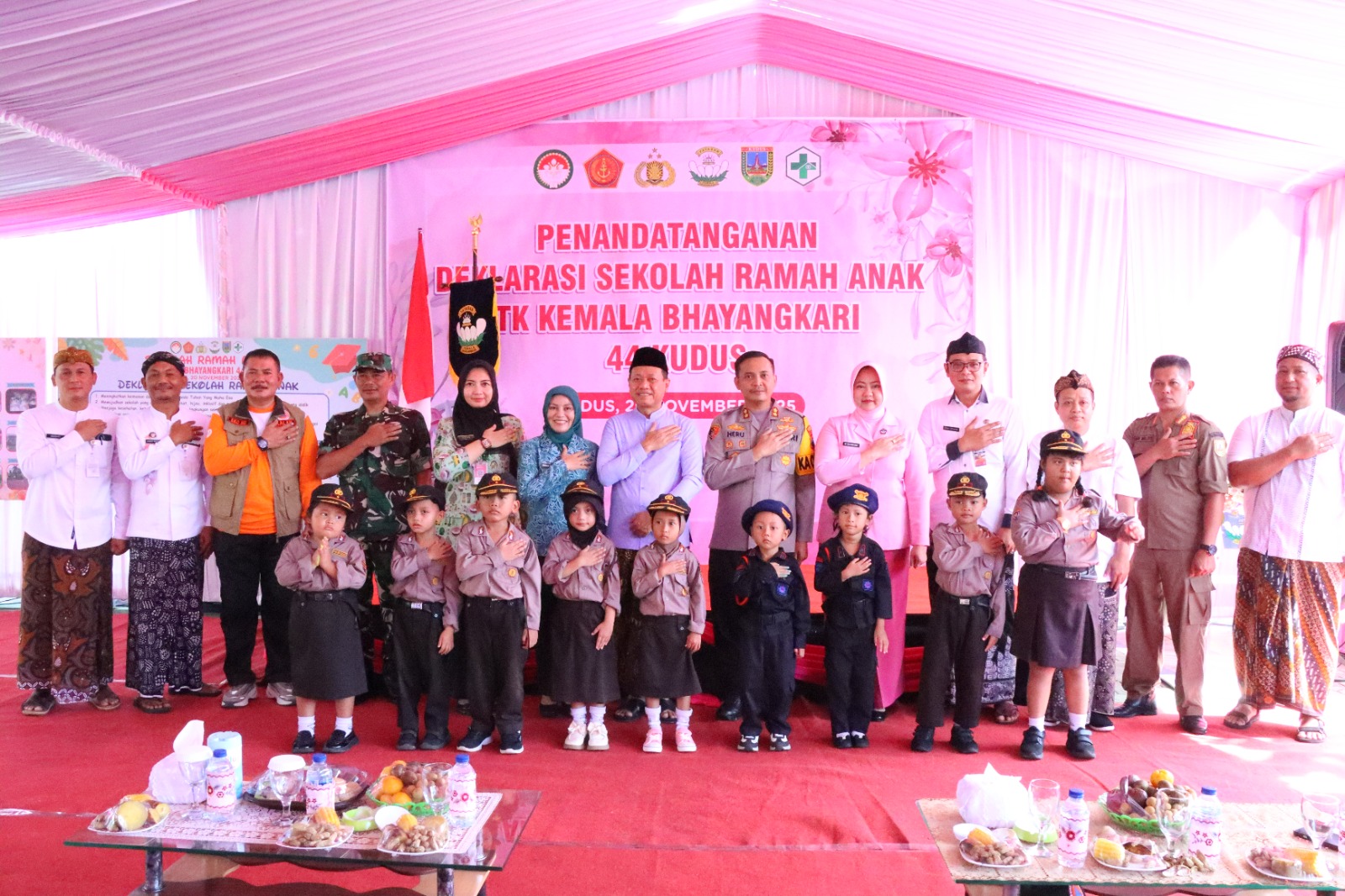 KUDUS – Kapolres Kudus AKBP Heru Dwi Purnomo bersama Bupati Kudus Sam’ani Intakoris menghadiri kegiatan Penandatanganan Deklarasi Sekolah Ramah Anak di TK Kemala Bhayangkari 44 dan 45 Kudus, Kamis (20/11/2025).
