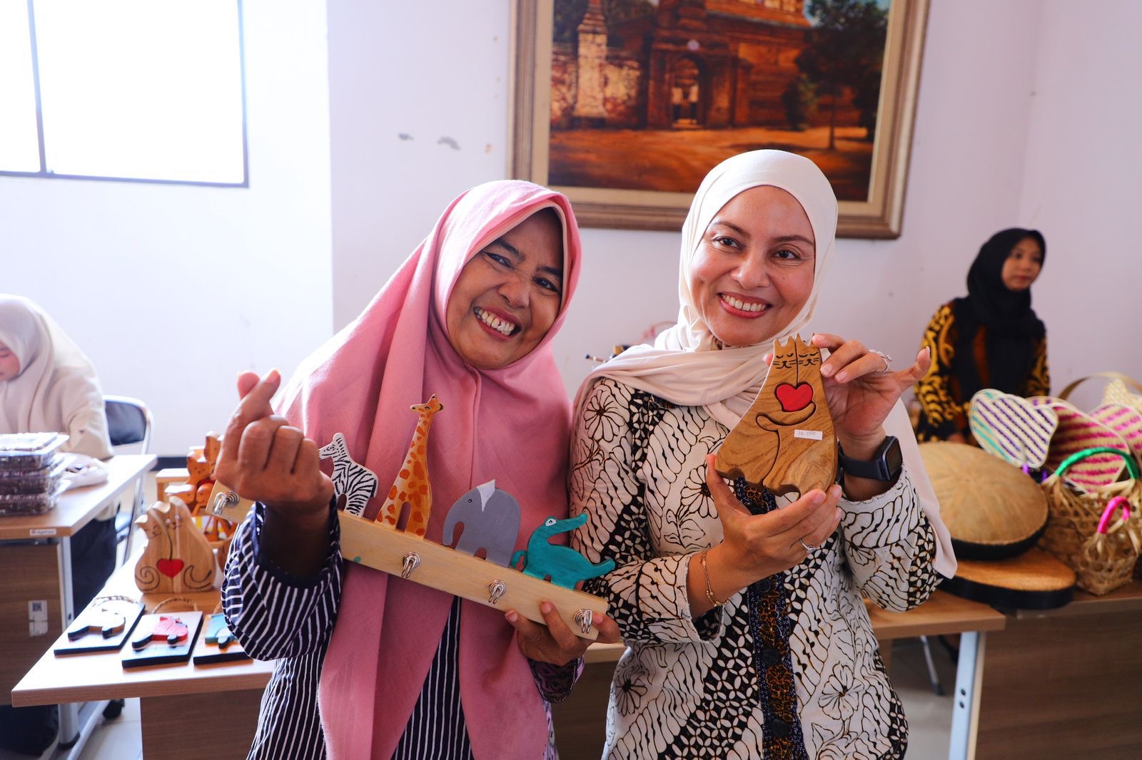 Berbagai produk kerajinan kayu terpajang rapi, mulai dari gantungan kunci, hiasan dinding, puzzle edukatif, hingga mainan mobil-mobilan kayu.