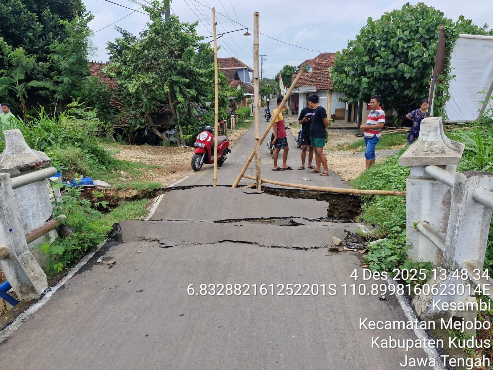 KUDUS – Kondisi Jembatan 1 di Desa Kesambi, Kecamatan Mejobo, Kudus, memprihatinkan setelah ditemukan retak parah pada bagian ujung konstruksi, Kamis (4/12/2025). Kerusakan ini diperkirakan terjadi akibat tekanan kuat dari arus sungai yang meningkat drastis usai hujan deras sepanjang hari.