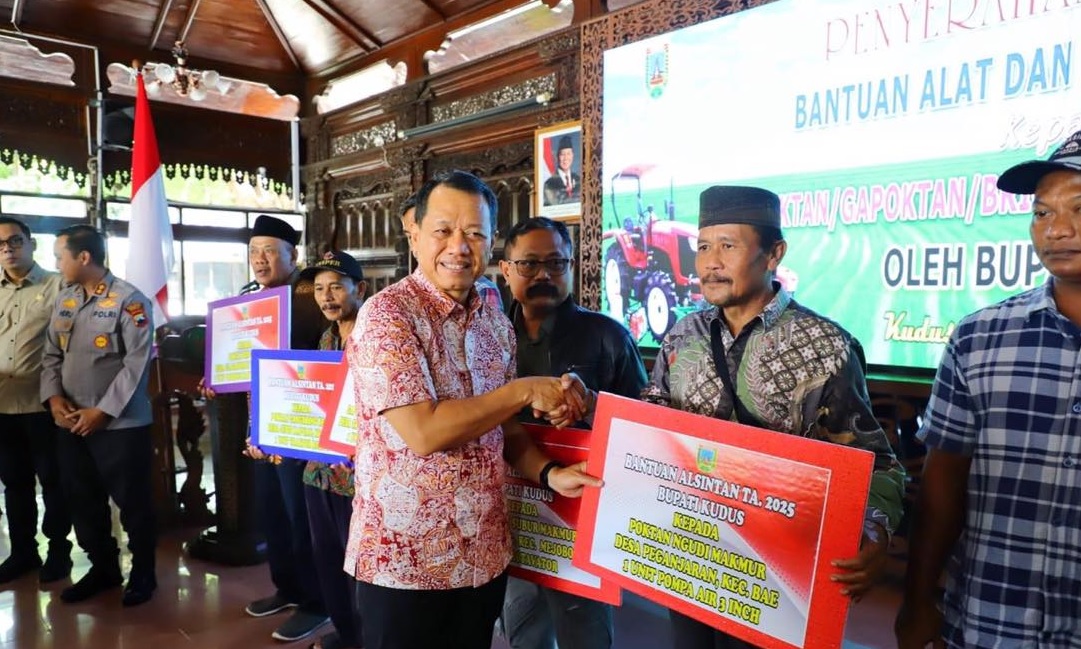 KUDUS, Kaifanews – Dukungan terhadap sektor pertanian di Kabupaten Kudus kembali ditegaskan melalui penyerahan bantuan alat dan mesin pertanian (alsintan) kepada kelompok tani (poktan), gabungan kelompok tani (gapoktan), serta brigade alsintan. Penyerahan dilakukan secara simbolis di Pendapa Kabupaten Kudus, Selasa (16/12/2025).