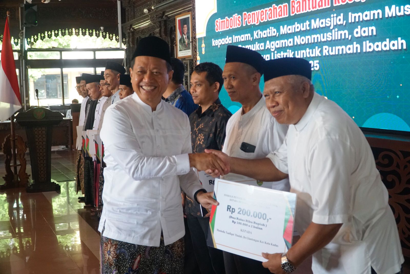 KUDUS, Kaifanews – Pemerintah Kabupaten Kudus menggelar kegiatan simbolis penyerahan bantuan kepada imam, khatib, marbut masjid dan musala, serta bantuan token listrik bagi seluruh rumah ibadah, baik muslim maupun nonmuslim, pada Kamis (18/12/2025).