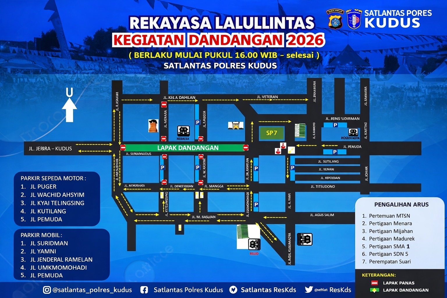 KUDUS – Menjelang digelarnya tradisi Dandangan 2026, Pemerintah Kabupaten Kudus bersama kepolisian mulai melakukan penyesuaian arus lalu lintas di kawasan pusat kota. Area sekitar Alun-alun Kudus menjadi perhatian utama seiring meningkatnya aktivitas persiapan kegiatan budaya tahunan tersebut.