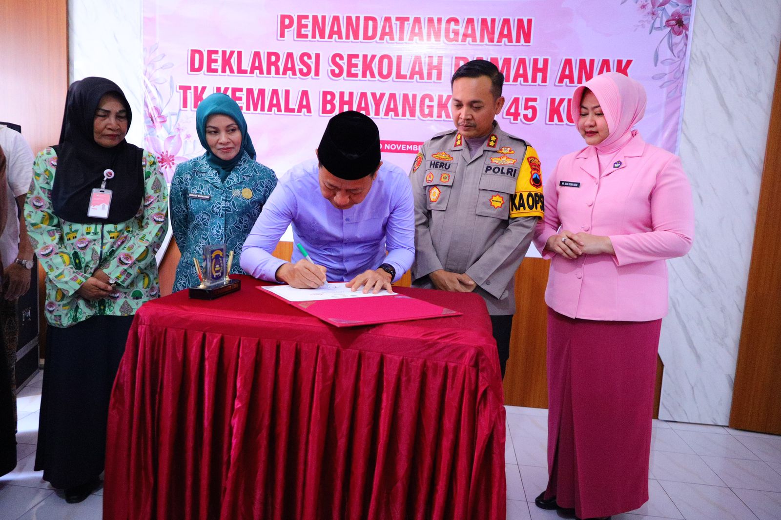 KAIFA NEWS – Kudus, 20/11/2025, Deklarasi Sekolah Ramah Anak di TK Kemala Bhayangkari 44 dan 45 Kudus resmi ditandatangani oleh berbagai instansi dan unsur masyarakat, Kamis (20/11). Penandatanganan dilakukan oleh Bupati Kudus Sam’ani Intakoris, Bunda PAUD Kudus, Ketua Pengurus YKB, Kapolres Kudus, Kadinsos, Kadis Dukcapil, Kepala BPBD, Kepala Damkar, Kepala Puskesmas Kecamatan Kota, Camat Kota, Danramil Kudus, Kapolsek, Korwil Kecamatan Kota, pengawas TK, Kepala Desa Rendeng, kepala sekolah, komite sekolah, wali murid, serta perwakilan murid dengan cap jempol. Sejumlah OPD terkait juga turut hadir dalam acara tersebut.