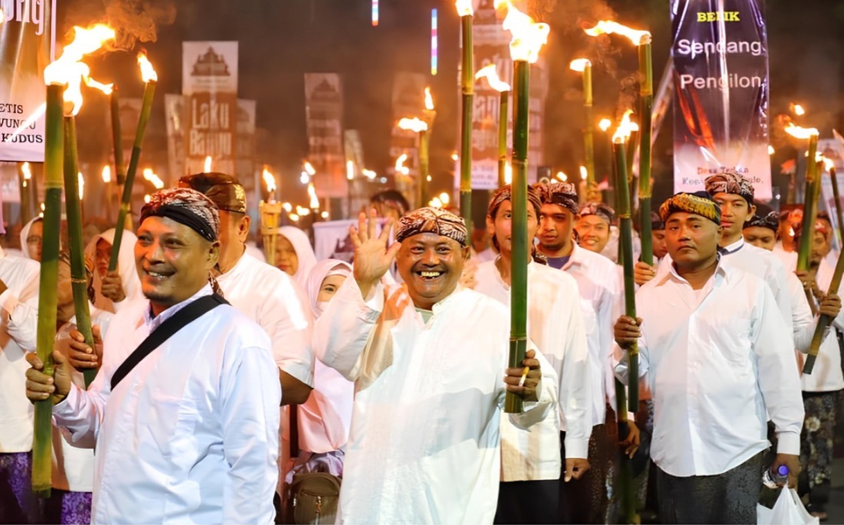 Rombongan peserta kirab bergerak sambil membawa obor menyala dan spanduk bertuliskan “Laku Punden dan Belik”, bergerak meninggalkan Pendapa sebagai tanda dimulainya prosesi sakral perjalanan menuju Menara Kudus.